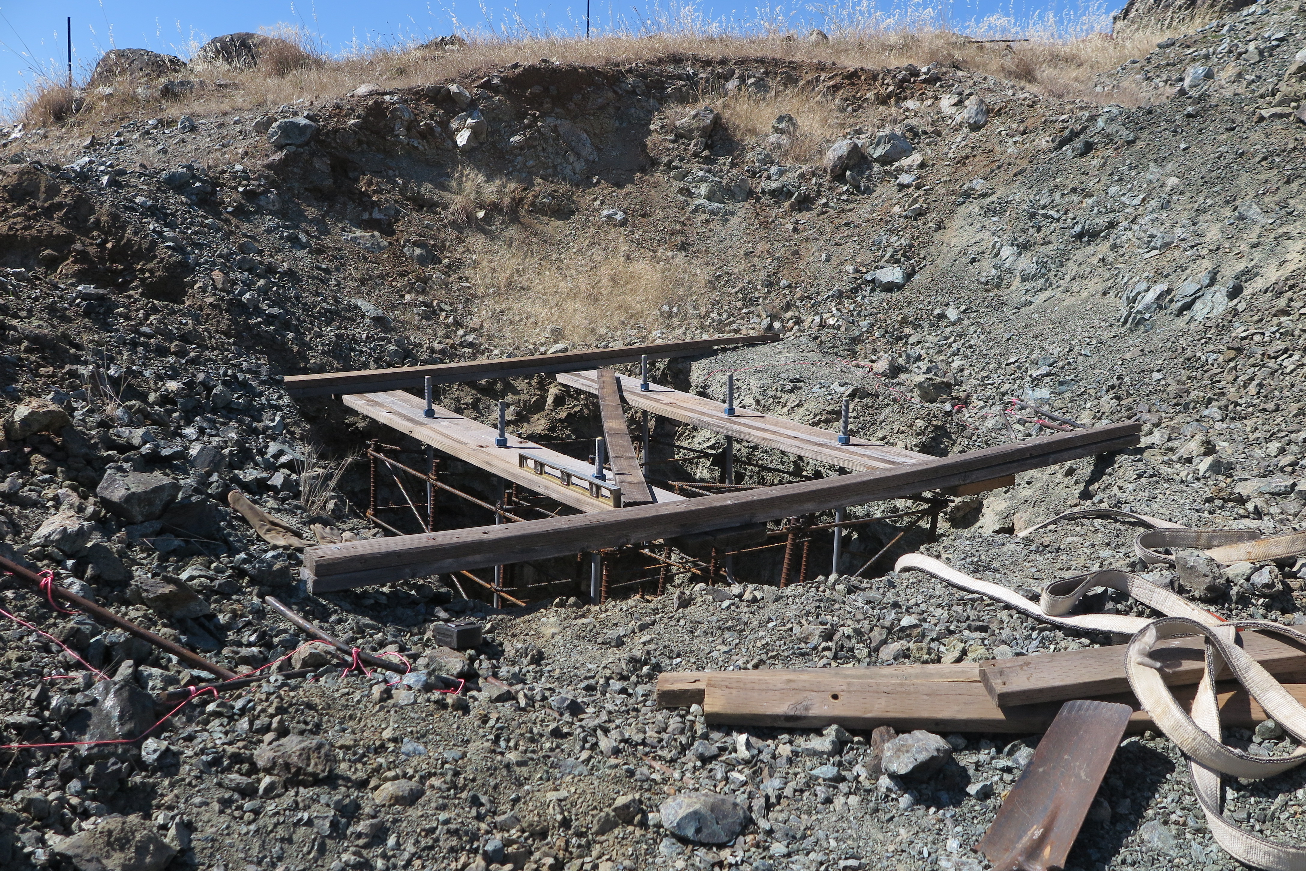 There are 4 guy anchors. This is the hole for one of them in which a rebar cage gets lowered with the galvanized steel anchor attached. The hole is 5' deep as per the county approved plans.