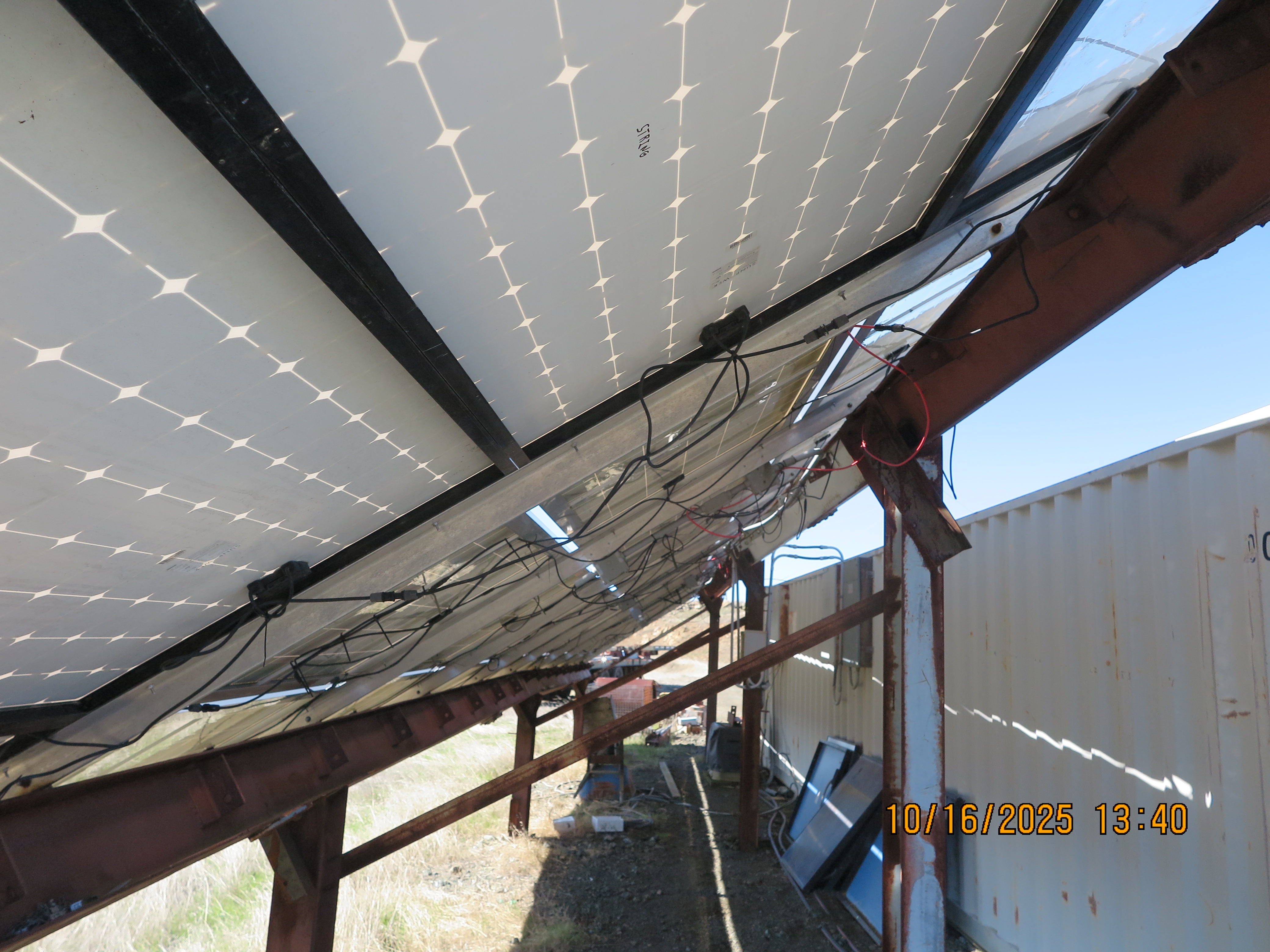 Here is the underside of the PV array. I am in the process of wiring the cells. Each string is three cells in series, and two of those in parallel. That gives about 14 amps at 95 VDC or so. The entrance to the container has two combined strings which I am calling Zone 1 and Zone 2 of 95 VDC at around 45 amps each in full sun.